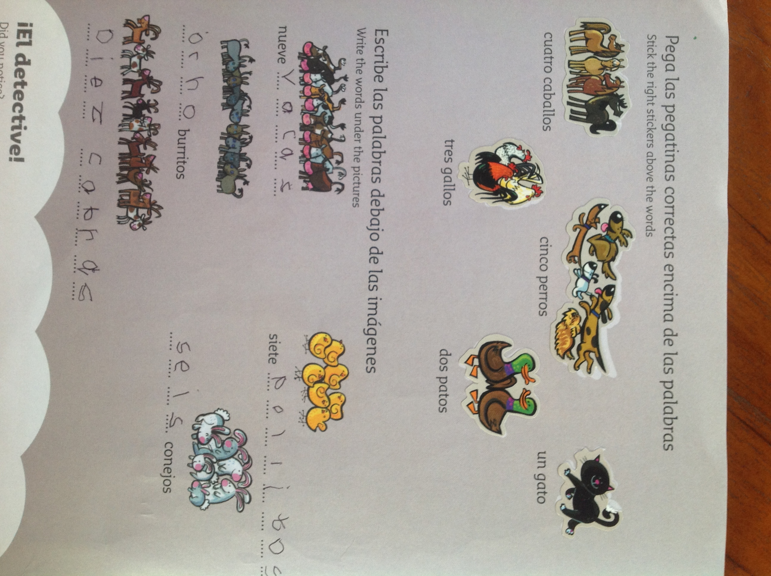 The words are in alphabetical order (by English unfortunately) and despite it being repetitive, my son was charging along with this book and maybe even learning a few words along the way. He got up to the letter P, and then the colour of the stickers stopped matching the spot on which to put them and it was all over. He abandoned it and hasn’t looked at it since. Sigh.